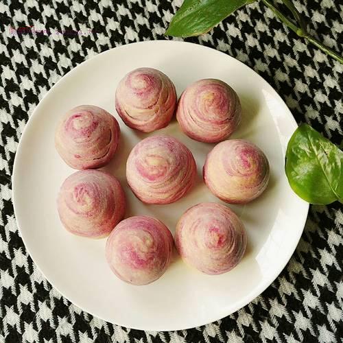 水油皮材料如下~() 中筋面粉(160克) 玉米油(50克) 水(60克) 油酥材料如下~() 中筋面粉(110克) 玉米油(55克) 紫薯泥(60克) 餡料~紅豆沙(適量)
