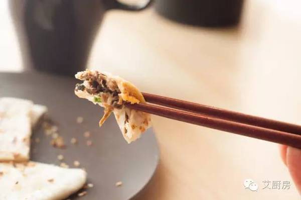 5.取一個(gè)面團(tuán)壓扁搟成圓形,包上肉餡。