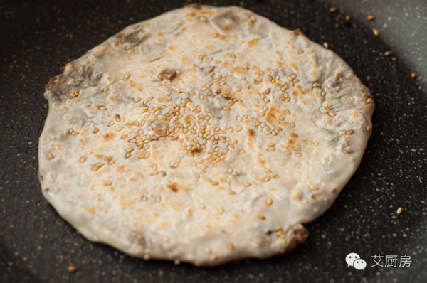 7.收口朝下,輕輕壓扁,再用搟面杖輕輕搟開(kāi),可以灑一點(diǎn)兒白芝麻。