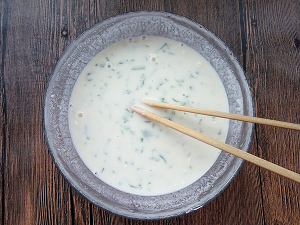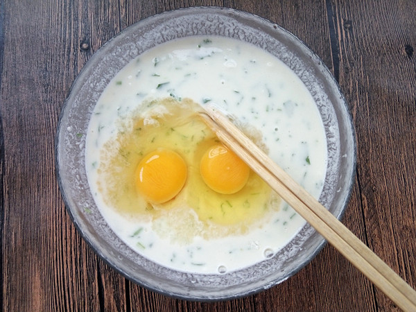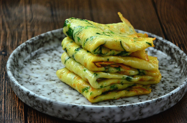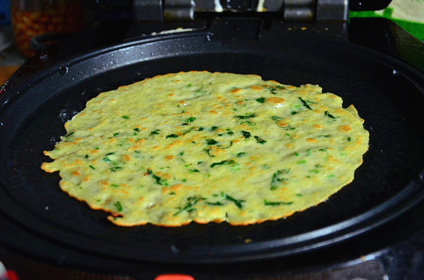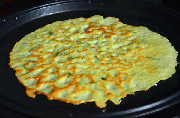 食材:面粉 130克 雞蛋 2個(gè) 水 280 克 香菜 一顆 鹽、雞精 適量 (這個(gè)量大約6張餅,兩個(gè)人的量,一人吃可減半)