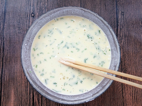 四、將雞蛋順著一個(gè)方向打散,攪打成均勻的雞蛋面糊