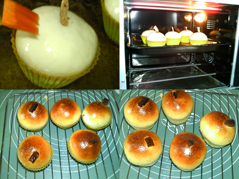 面團(tuán)長(zhǎng)大,表面刷蛋液,放入烤箱,中層,上下火150度,烤約15分鐘左右,表面金黃,出爐。立即脫模,晾涼。