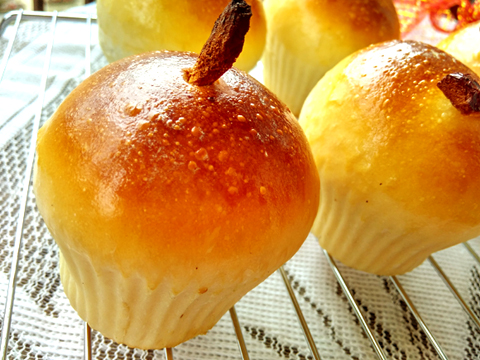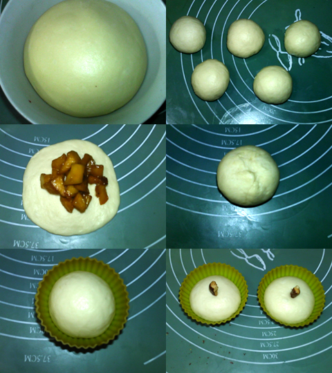 面團(tuán)長(zhǎng)大至兩倍。排氣,分割成5等分,滾圓,松弛15分鐘。搟成圓餅狀,放入蘋(píng)果粒。包好,捏緊收口。收口向下,放入馬芬模中。紅棗切條,插在面團(tuán)上。進(jìn)行最后發(fā)酵。