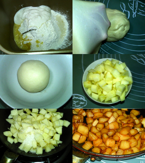 將所有面團(tuán)料倒入面包機(jī),啟動(dòng)和面程序。攪拌至能拉出薄膜。放入大碗,進(jìn)行基礎(chǔ)發(fā)酵。蘋(píng)果洗凈去皮核蒂把,切丁,放入鍋中,加糖,中小火翻炒。湯汁收干,蘋(píng)果呈焦糖色。熄火,冷卻備用。