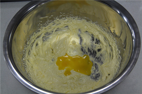 2、倒入半個蛋黃,繼續(xù)打發(fā)至蛋黃與黃油完全混合均勻