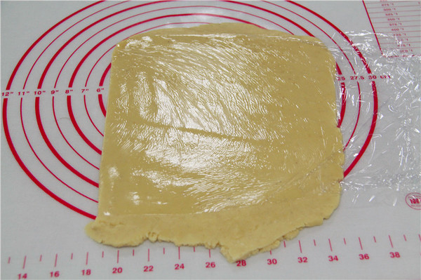 4、用手揉成為光滑的面團后放在兩層保鮮膜的中間,然后搟成3毫米左右的片狀,放冰箱冷藏松馳半個小時