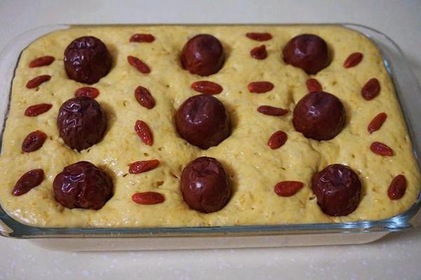 5、放入蒸鍋中,發(fā)酵半小時(shí)。這期間把棗洗凈,泡發(fā)一些枸杞。