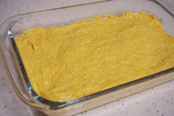 4、找個(gè)耐高溫的容器,刷上一層油。將南瓜糊放入容器中。