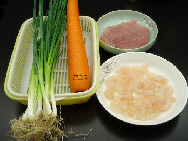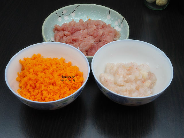 2.蝦仁去蝦線,洗凈,剁碎;瘦肉洗凈剁碎;胡蘿卜去皮洗凈切碎;香蔥、生姜分別洗凈剁碎;