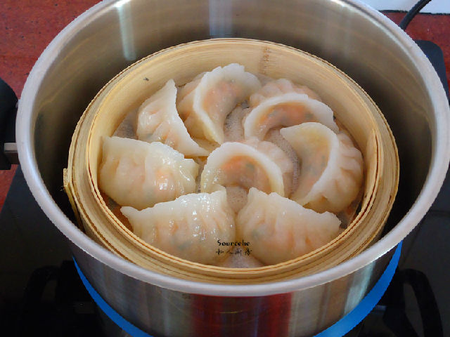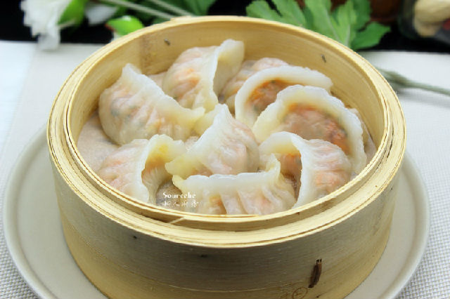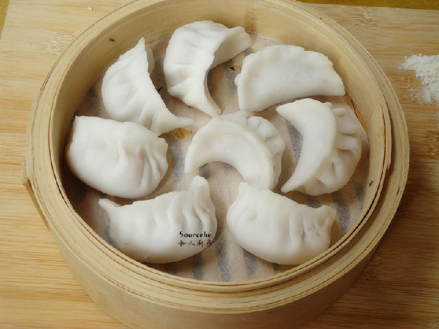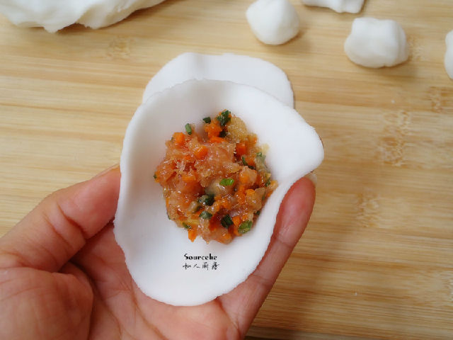4.包的時(shí)候不要太多餡,蝦仁蒸熟會(huì)膨脹,防止破皮。