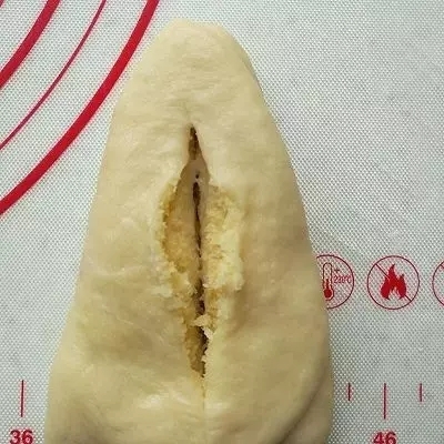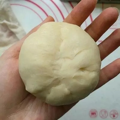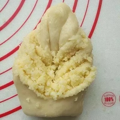 取一個小面團搟扁,包入椰蓉餡。注意要盡量排凈面團里面的空氣,收口捏緊。