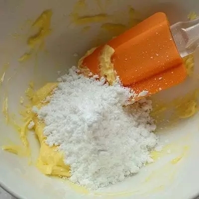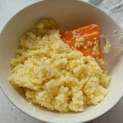 等待面團第一餳發(fā)的時候可以做椰蓉餡。黃油軟化后打散,加入糖粉。