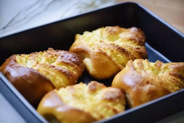 然后把尖頭從中間掏過去,翻過來整型。其中幾個面團也同樣操作。然后排在烤盤上,放進烤箱進行二發(fā)。