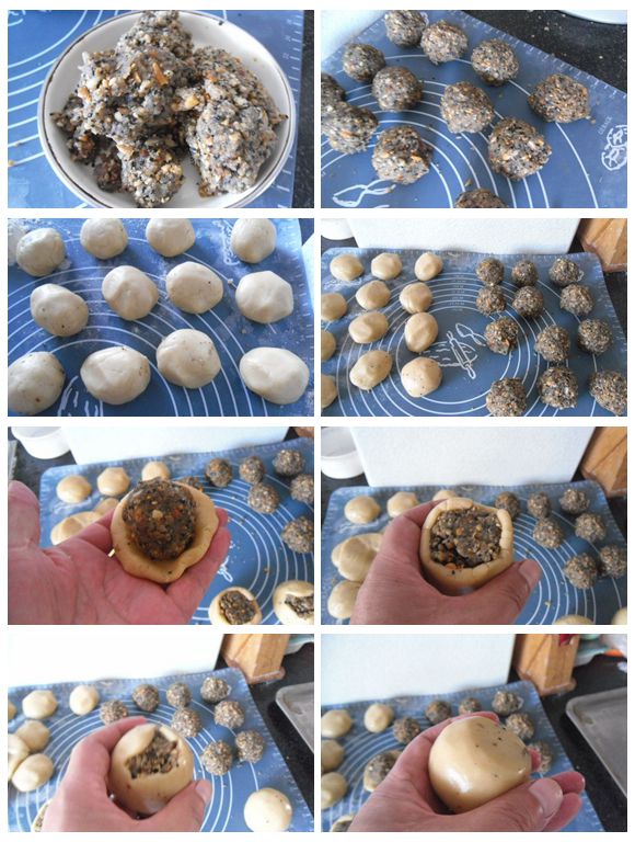 11、把面團稱重,每個30克。12、取一塊面團按扁,放入五仁餡。