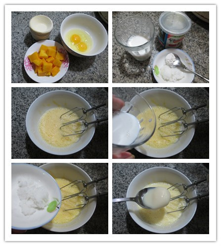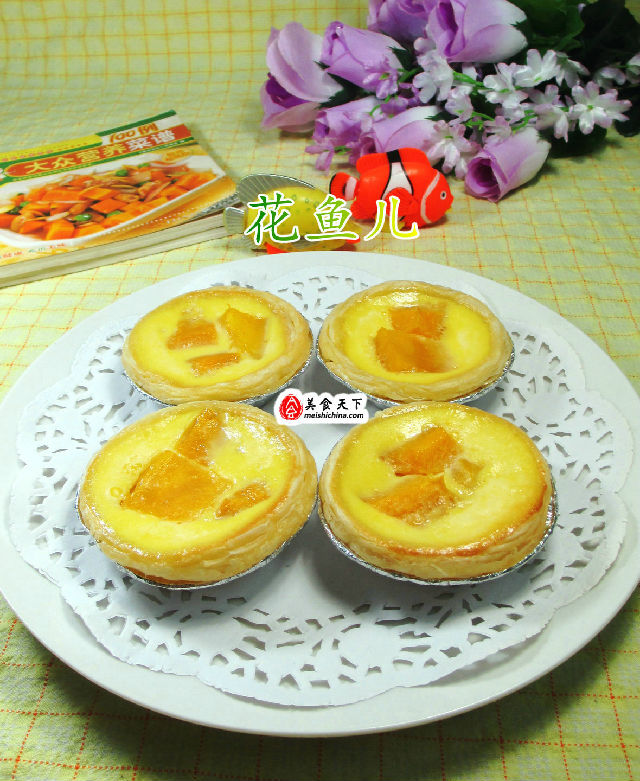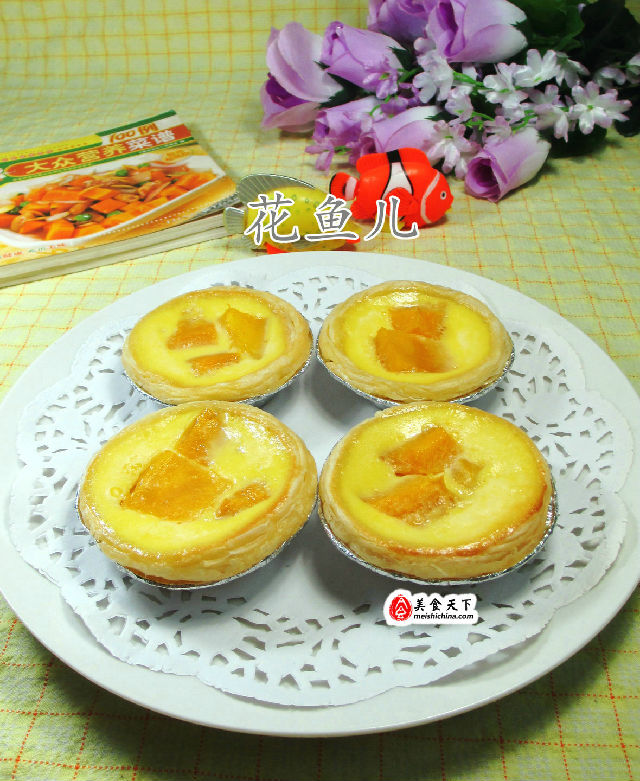 食材:蛋撻皮10個(gè)、雞蛋2只、芒果185克(已去皮切開(kāi))、牛奶70克、綿白糖10克、煉乳、低筋面粉5克