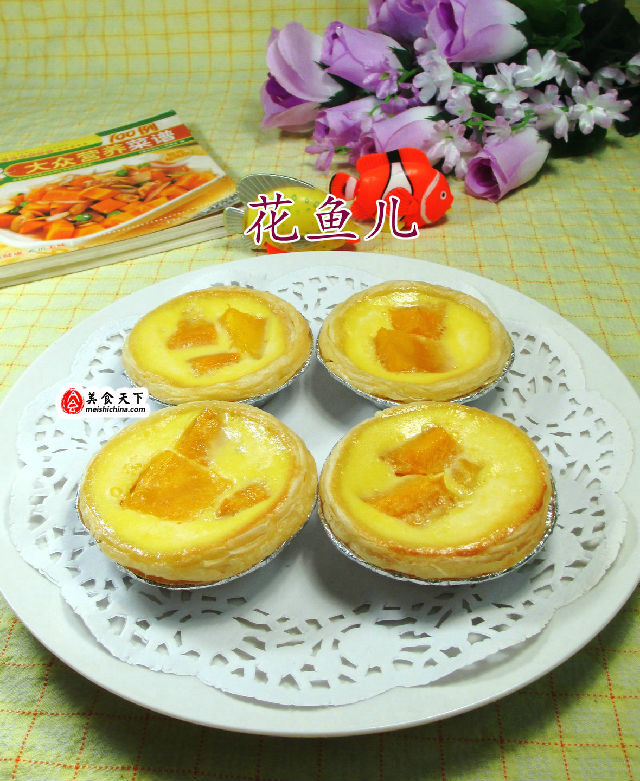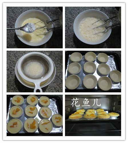 (4)然后,將蛋撻皮置入烤盤中,擱入切好的芒果、用勺子舀入牛奶蛋液。