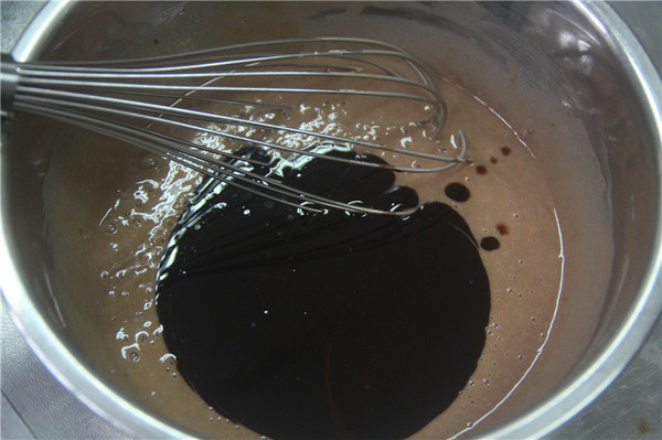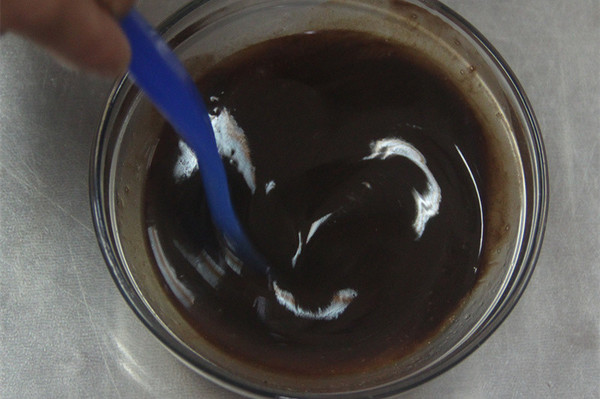 4、再倒入黃油巧克力液攪拌均勻,攪拌成巧克力面糊即可