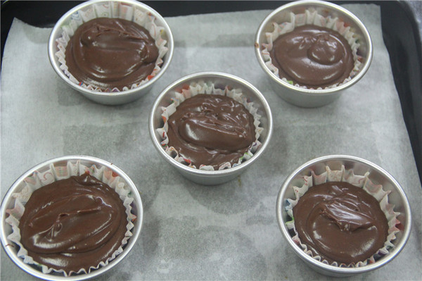 5、將攪拌好的面糊裝入裱花袋,擠入紙杯中(中號(hào)紙杯,8分滿)