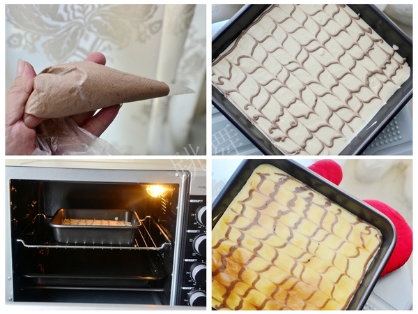 8、以線狀形式擠在芝士糊表面,然后用牙簽隨意劃出你中意的大理石花紋