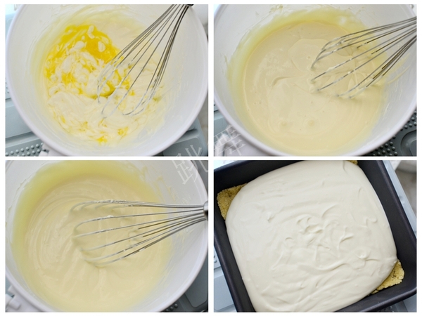 芝士糊攪拌過程中材料要分次加入,以保證最后的糊質(zhì)地細膩
