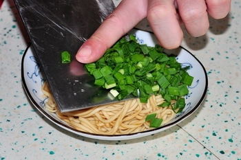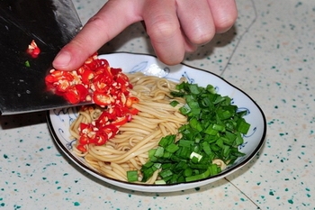 兌調料:醬油、藤椒油、香油、鹽、味精、韭菜、小米辣