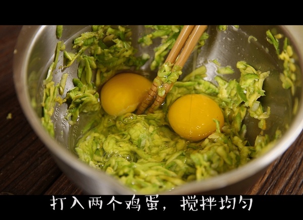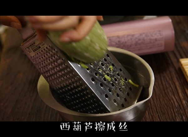 1,西葫蘆擦成絲,加入鹽,五香粉和蔥花攪拌均勻