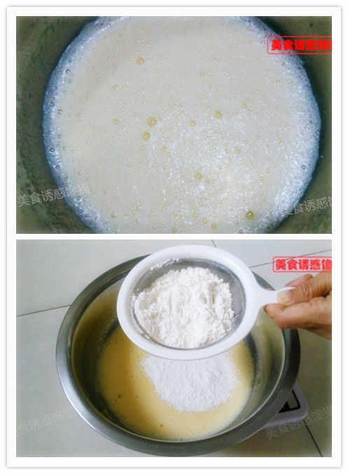 2、蛋白加入檸檬汁、玉米淀粉,分三次加入白糖,打發(fā)至硬性發(fā)泡。