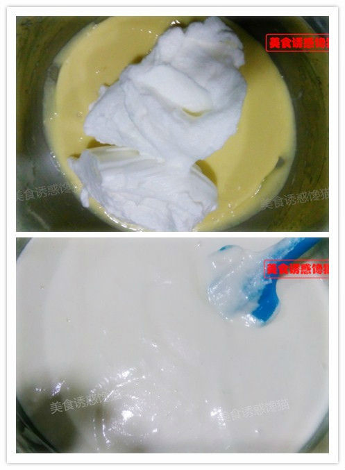 3、將打發(fā)的蛋白分二次加入到蛋黃糊中,用橡皮刮刀翻拌均勻,靜置10分鐘,備用。