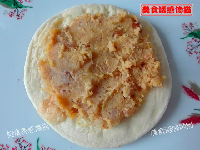 8、戴上一次性手套,取一片餅皮,將蓮蓉花生餡抹在氣泡面。