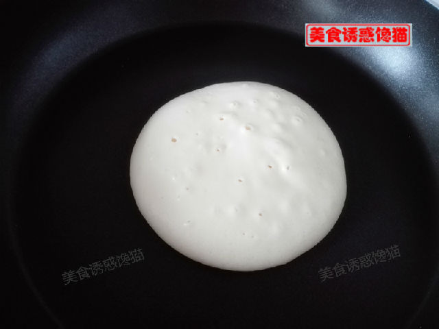 4、平底不粘鍋預熱,不用放油,舀一勺面糊倒入,讓面糊自然流淌成圓形,全程小火。