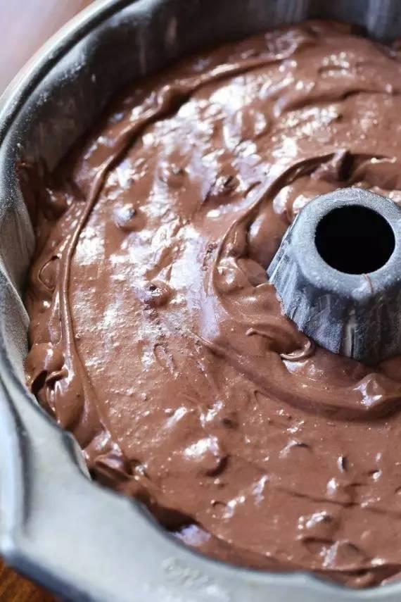 5、將攪拌碗四周的面糊刮下,分兩次緩緩加入剩下的可可混合物,每次添加之后攪打20-30秒,使原材料完全混合并且強化蛋糕的結(jié)構(gòu)