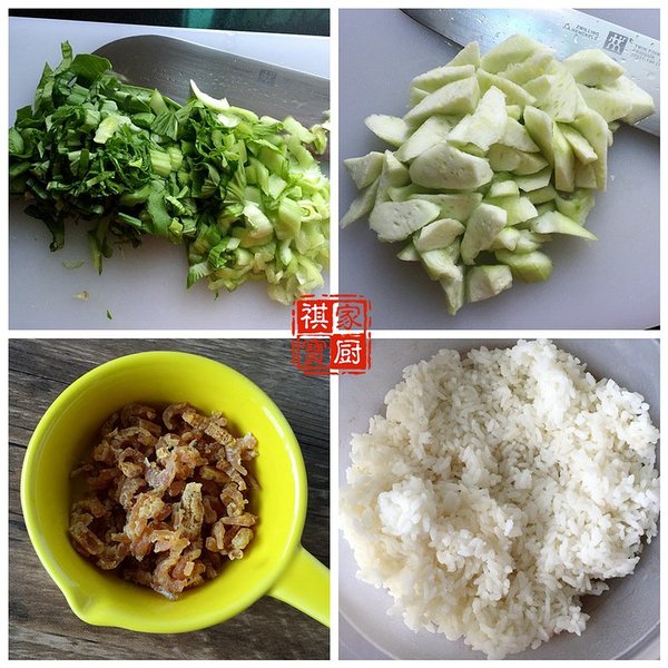食材都是順手拈來的,青菜、絲瓜、開洋、隔夜的冷飯、橄欖油、鹽、雞精(介意的可不加)。