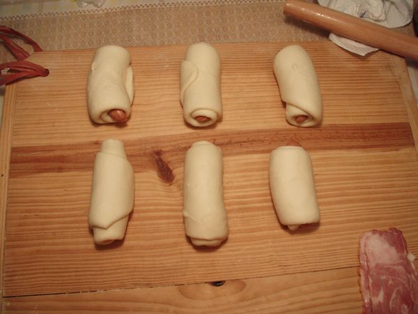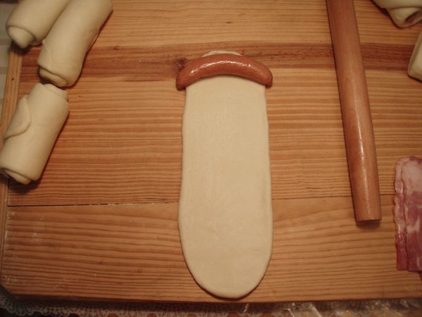 3、待發(fā)酵好以后,把面團(tuán)拿出來,分割成12份,分別用搟面杖搟成長形薄皮。