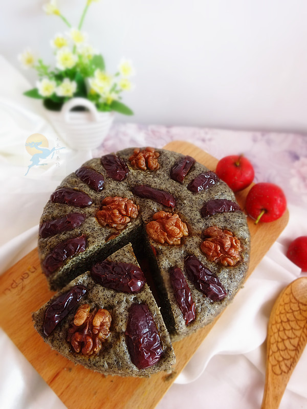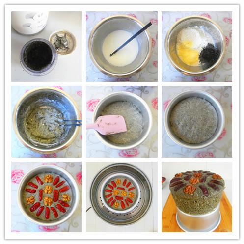 材料:白面200克,玉米面50克,熟黑芝麻50克,糖40克,大紅棗和核桃仁適量。