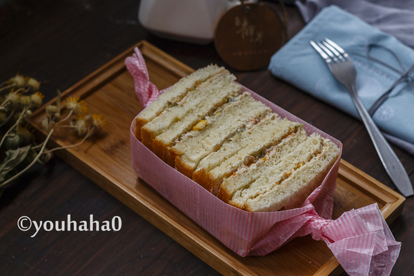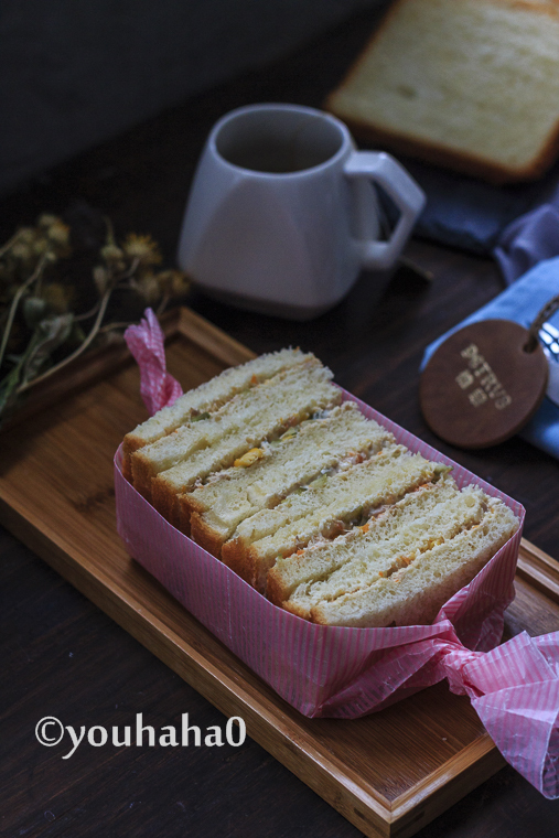 8、酸黃瓜切小丁與沙拉醬金槍魚拌勻,面包切片涂抹金槍魚沙拉醬,蓋上一片面包,切掉周邊,對切開即可,配一杯豆?jié){或牛奶,健康營養(yǎng)早餐