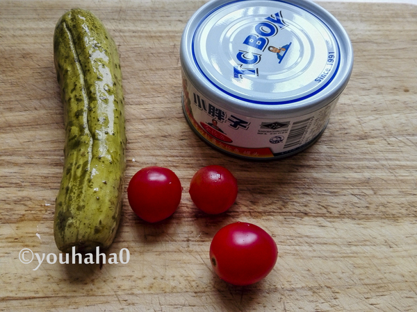7、準(zhǔn)備材料做三明治的夾餡,酸黃瓜一根、沙拉醬金槍魚一罐,圣女果擺上未用