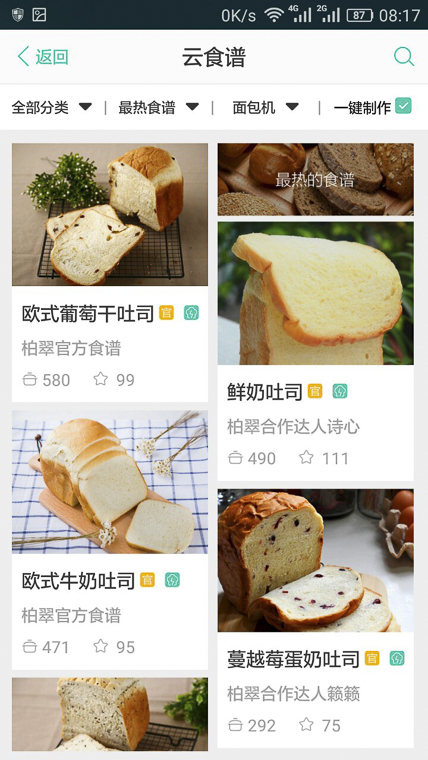 2、啟動云食譜,選擇其中的歐式牛奶面包,點開后出現(xiàn)操作步驟及配料,按照配料表中的要求準(zhǔn)備材料