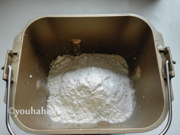 3、所有的食材全部放入面包機(jī)桶中,放入順序是先液體、酵母后粉類,鹽最后放