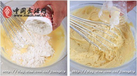 4.將過篩的低筋粉和乳化劑一起加入打發(fā)。