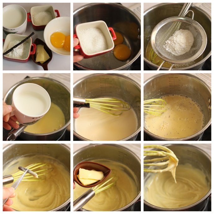 蛋黃30克,糖30克,低粉10克,鮮奶140克,香草莢1/4根,無(wú)鹽