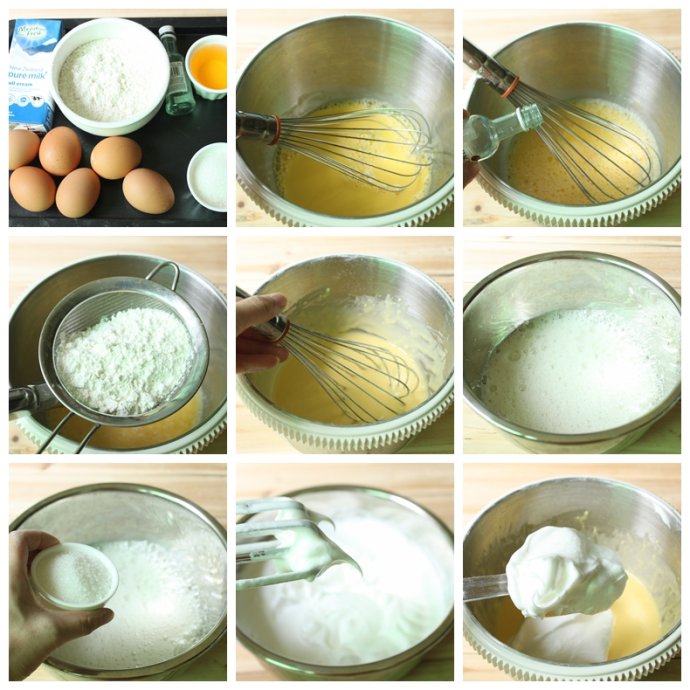3. 取1/3蛋白霜到蛋黃糊中用刮刀輕輕翻拌均勻(不要?jiǎng)澣Γ悦庀荩?br data-3Yej="dxBBM1">4. 再倒回剩余的蛋白霜中,同樣手法翻拌均勻,拌好的蛋糕糊要順滑細(xì)膩