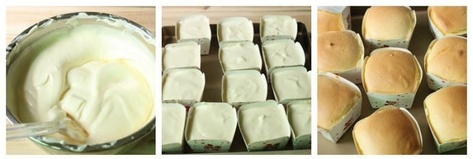 5. 用勺子將面糊小心填入方形戚風(fēng)紙杯中,約8分滿(mǎn)為宜(太滿(mǎn)容易大開(kāi)裂,爆頭)