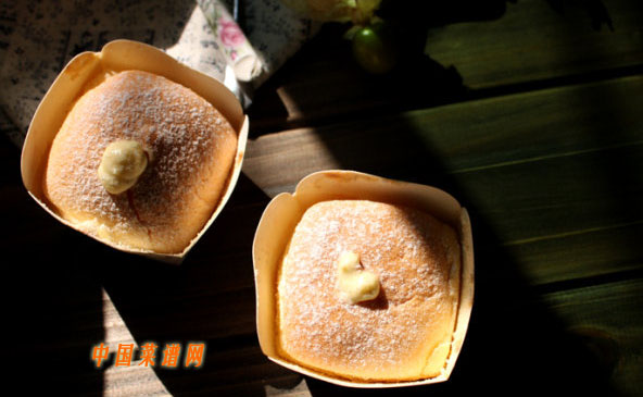 11 花嘴插入蛋糕內(nèi)部擠入(蛋糕表面微微鼓起即可,太多的話(huà)會(huì)使蛋糕脹裂),表面再篩少許糖粉裝飾即可