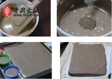 1、可可蛋糕片晾涼至稍微有余溫,翻面,底部墊油紙