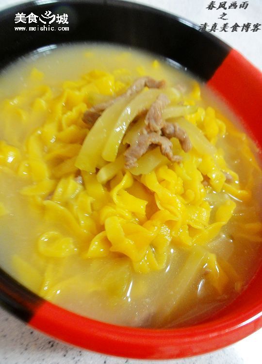 榨菜肉絲湯:榨菜1/2個(gè)、牛柳80克、蔥花、蒜瓣、生抽、清水1200克、鹽適量