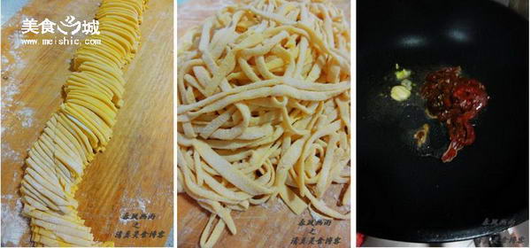 11、水燒開后,將手搟面抖去多余的面粉,均勻的放入鍋中。