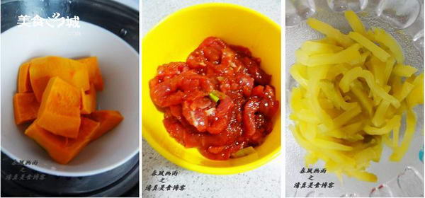 3、將榨菜去皮、去根蒂洗凈,切成與牛柳一樣的細(xì)絲。