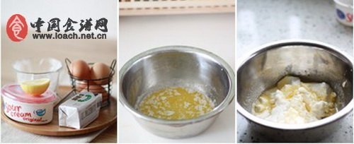 1 黃油隔水融化 稍微晾涼后用打蛋器和酸奶油攪拌均勻