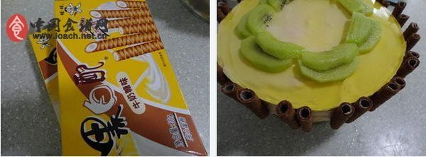 1、用電吹風(fēng)沿著模具周圍吹一會(huì),或者用熱毛巾捂一會(huì)就能脫模了。取出蛋糕,在周圍粘上蛋卷。擺上