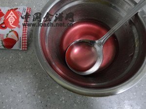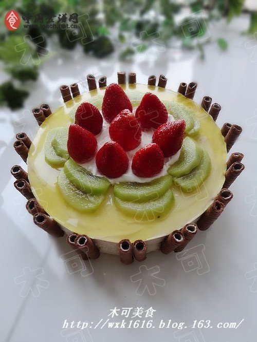 3、草莓味QQ糖加少許水,隔水融化后,在蛋糕上的水果表面刷一層,保持水果的鮮亮。一個(gè)香蕉慕斯蛋糕就完成了。
